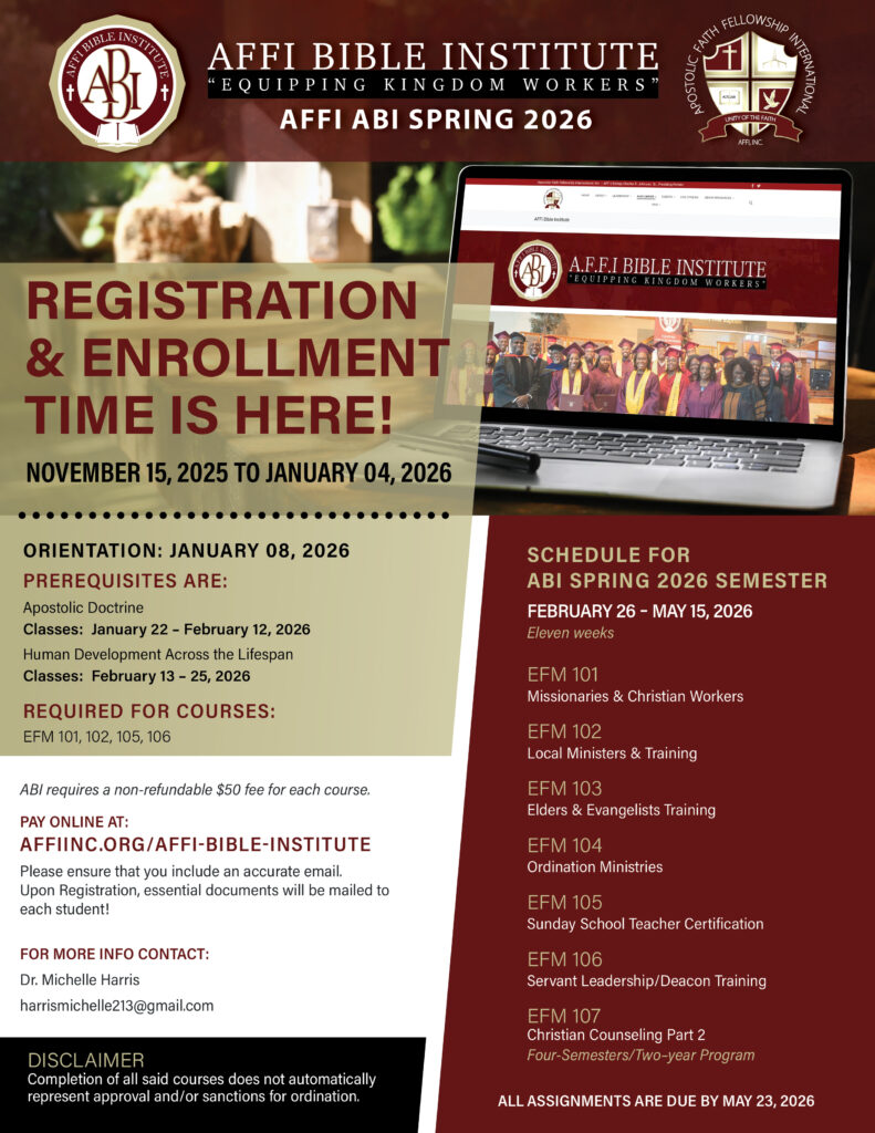 New Learning Management Systems training video.ABI StudentsABI Professors Bishop Dr. Joseph MarcusDirector District Elder Fletcher DavisAssistant Director Pastor Dr. Michelle Harris, Ph.D.ABI Administrator Elder Garnet SmithABI Asst. Administrator Bishop Dr. Reginald Burrows, Th.D., Ph.D.Curriculum Development EFM Course Selection & Payment: Submit ABI Student Log in: Log In GIVE TO AFFI BIBLE INSTITUTE Please enable JavaScript in your browser to complete this form.Name *FirstLastEmail *Donation Amount ($1.00 minimum) *Donation Type:Donation Total *$0.00Captcha * = EmailGive
